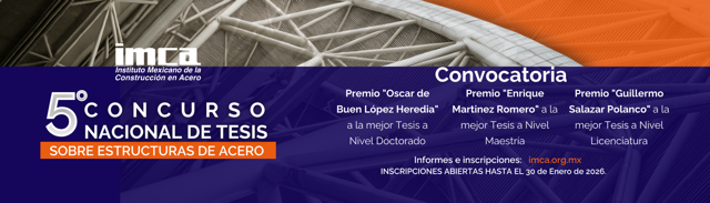 El Instituto Mexicano para la Construcción en Acero, A.C. (IMCA) convoca a todos los estudiantes de carreras afines a la Ingeniería y Arquitectura de las diversas Instituciones de Educación Superior en el país, a participar en el Quinto Concurso Nacional de Tesis a Nivel Licenciatura, Maestría y Doctorado sobre temas de Estructuras de Acero, que se llevará a cabo bajo las siguientes bases: